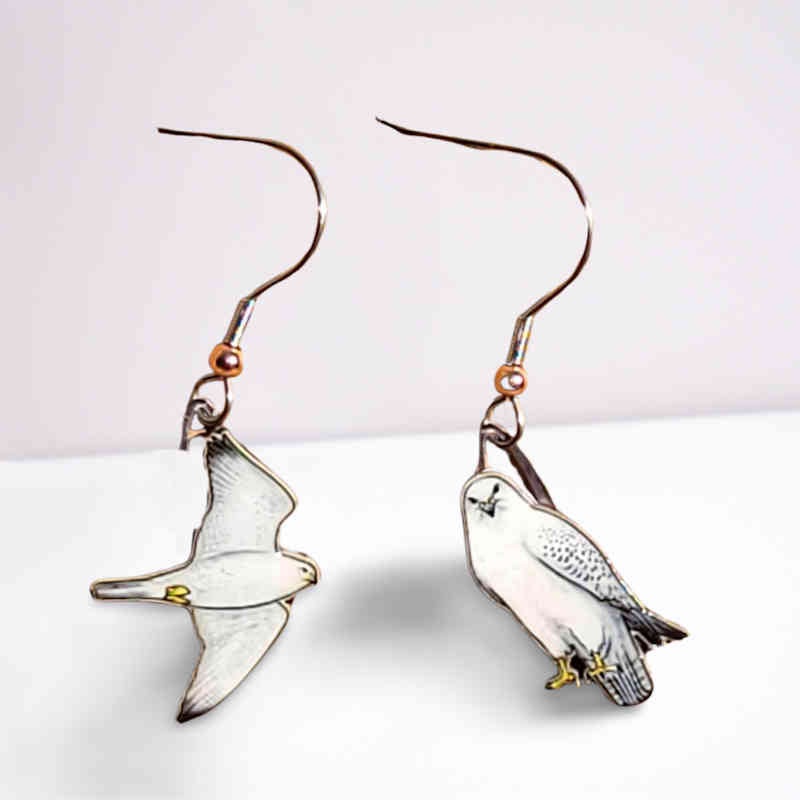 Handcrafted from upcycled cereal boxes, these Gyrfalcon earrings are feather-light and showcase two stunning poses of this magnificent bird!