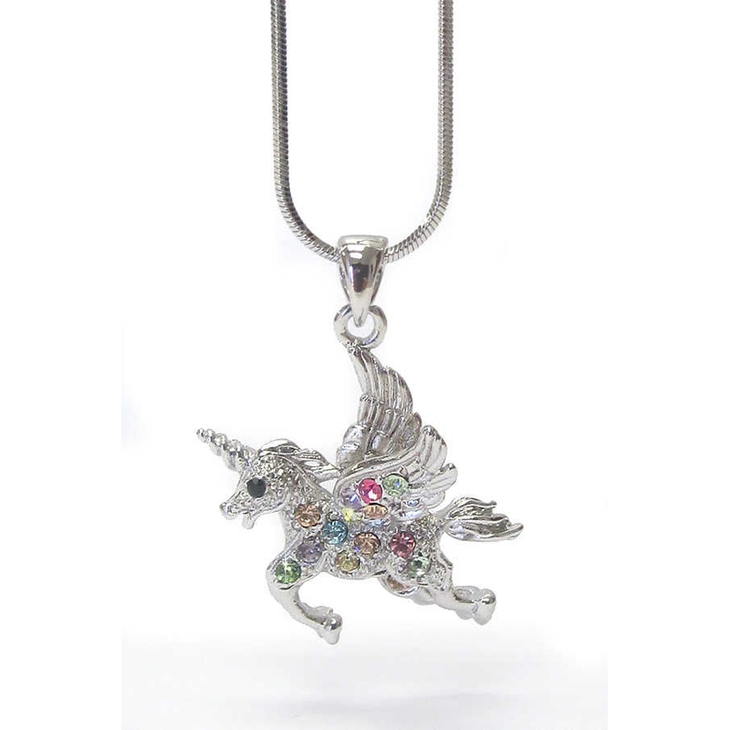 This dazzling Unicorn Necklace is shining bright – white gold plated with dazzling multi-colored sparkles everywhere!